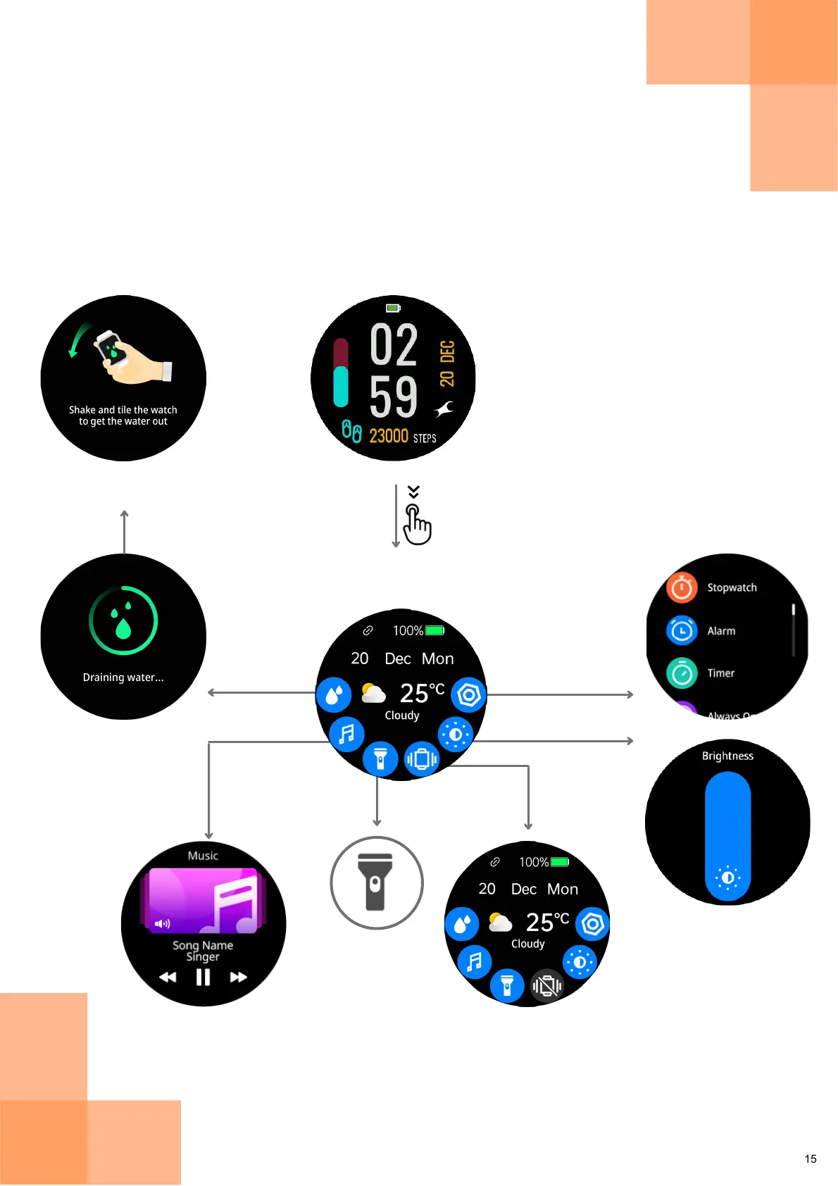 Control Music, Turn On/Off Flashlight and Vibration, Control Brightness, and access Settings