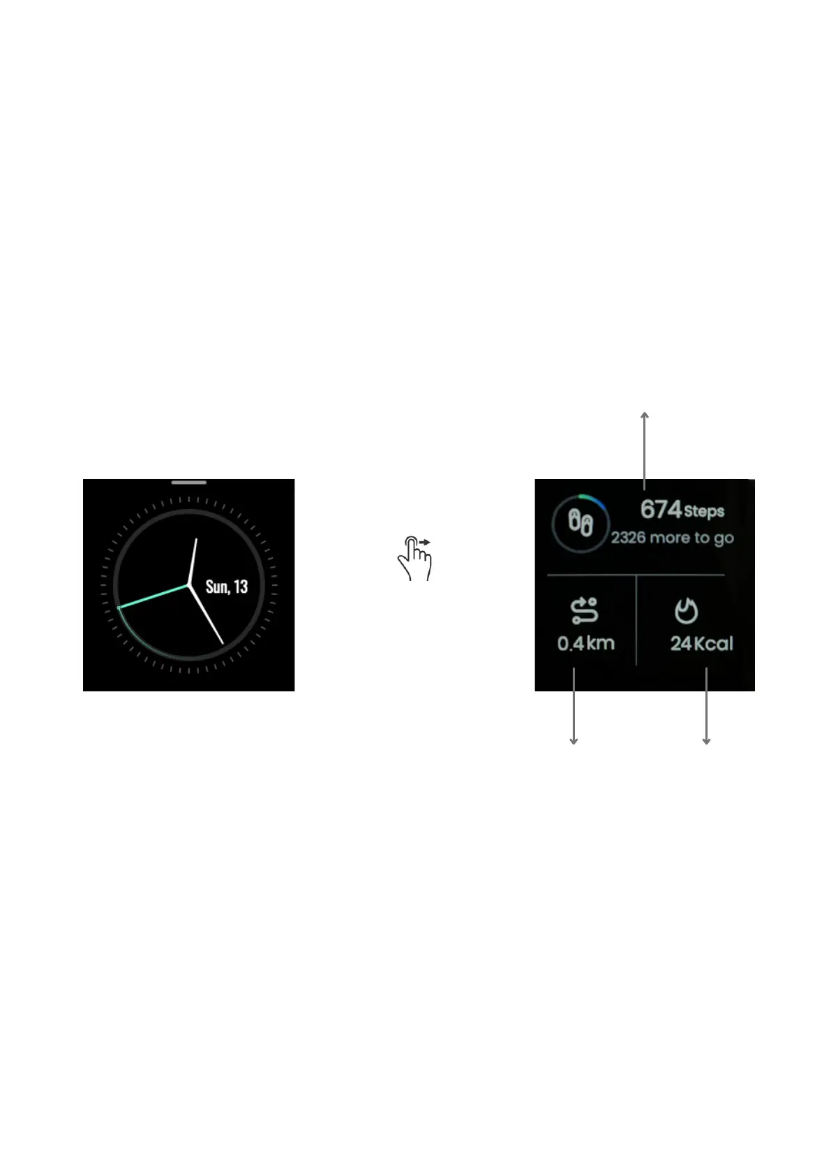 Swipe right to access the Activity Dashboard and view your Steps for the day, Distance