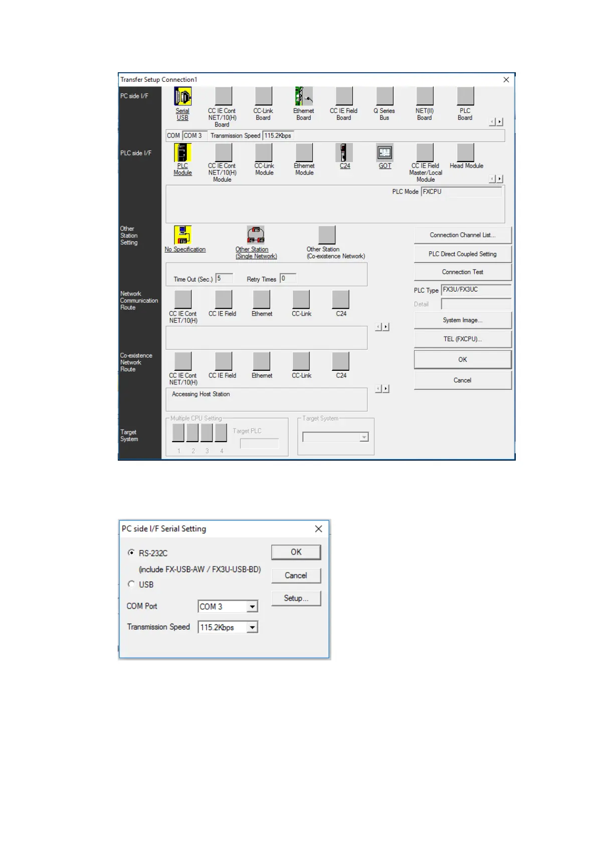 Select the RS-232C radio button and select the COM Port that the PLC is connected at.
