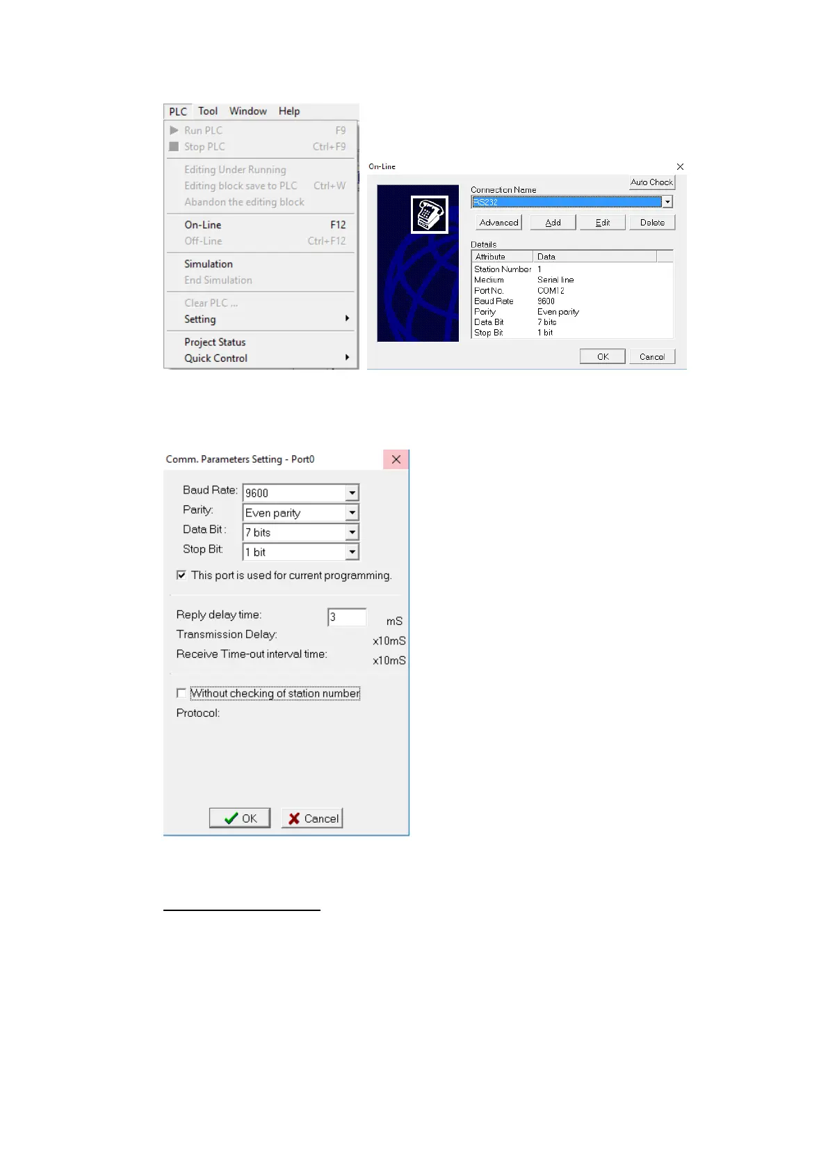 Under the PLC tab, select the Setting option and choose Port 0. Here, the Baud rate