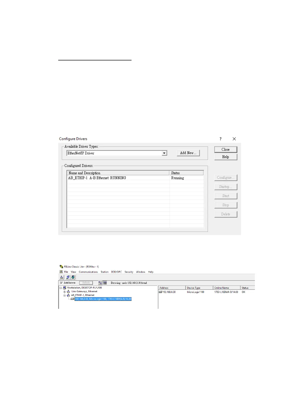 First open RSLinx Classic Lite to set up a connection between the computer and PLC.