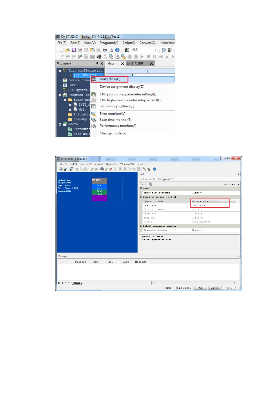 Choose KV mode (Host Link) and set the Baud rate to 115200.