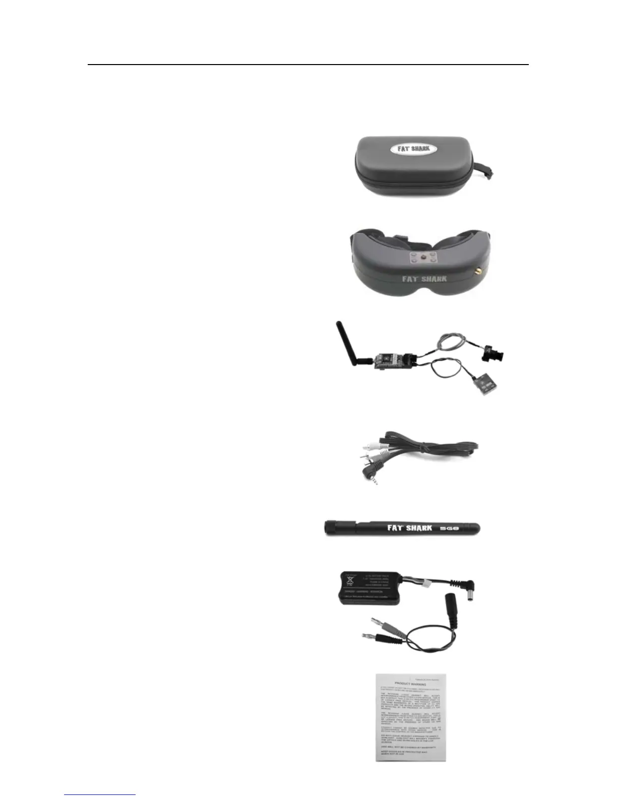 FatShark PREDATOR V2 - Product contents; Predator Headset; FPV kit (camera, TX, filter); Battery (with discharge adapter)