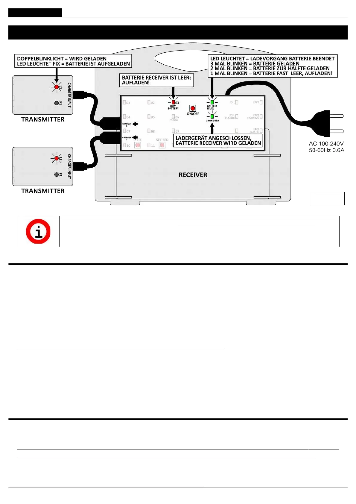 Laden der Batterie des RECEIVER: Speisekabel an eine Dose 100-240V anschließen: die LED