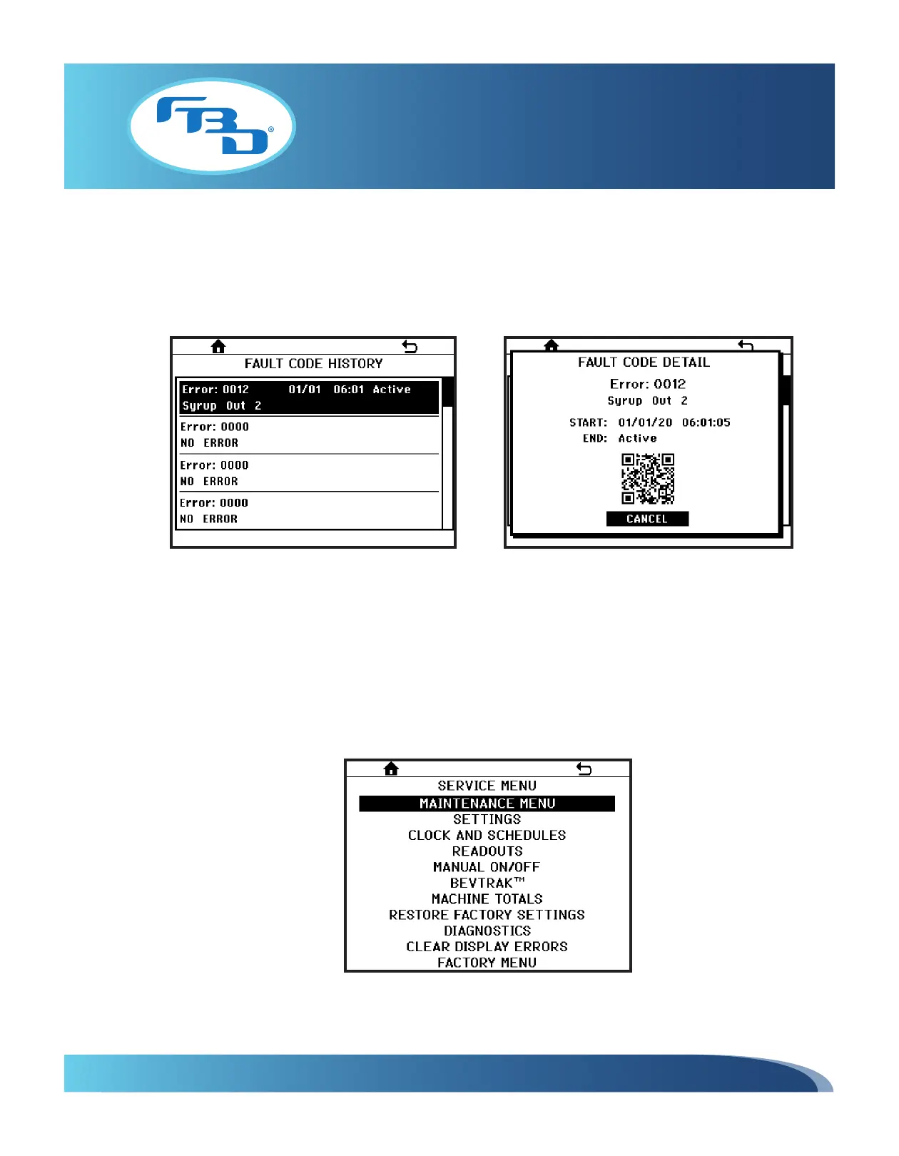 The FAULT CODE HISTORY menu provides a list of the last twenty fault codes with the date and time of occurrence and
