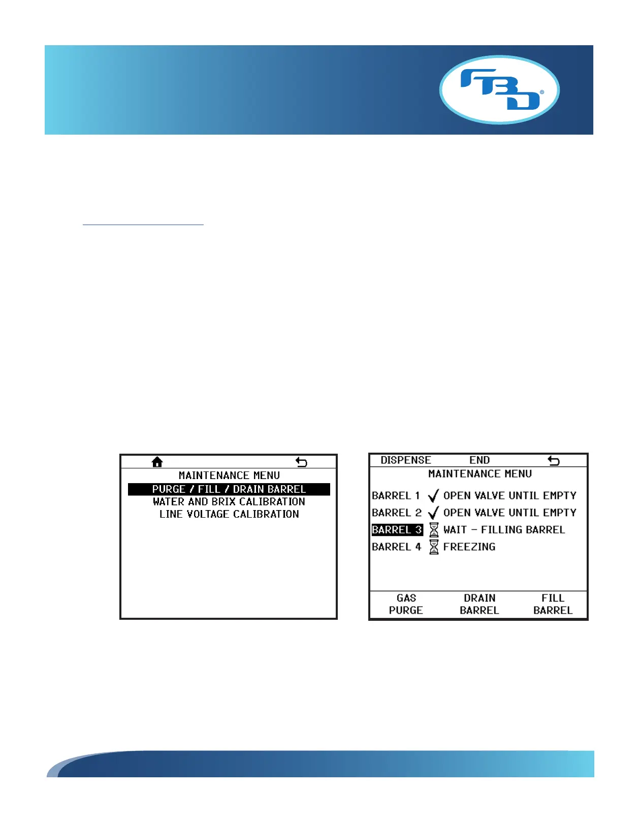 The MAINTENANCE MENU has three sections to choose from (Figure 7.11): PURGE/FILL/DRAIN BARREL, WATER AND