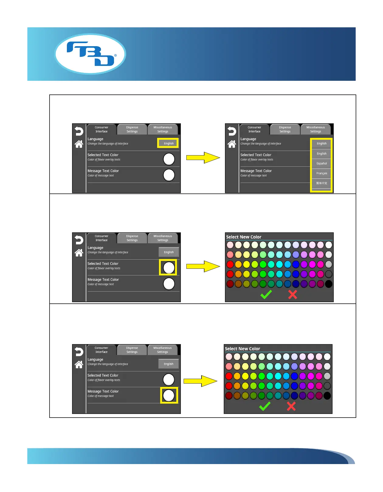 "Message Text Color" option. A color selection pop-up window will appear; once a color is selected, press the green