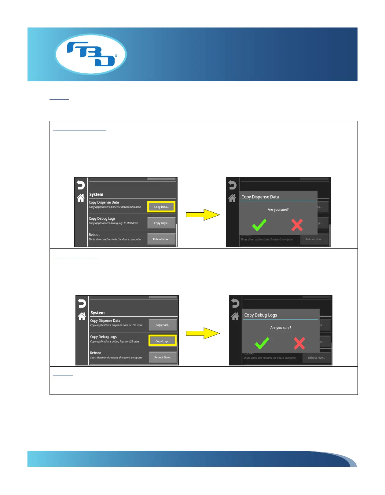 troubleshooting with FBD Technical Support. In order to use this option, a USB needs to be inserted into any of the USB