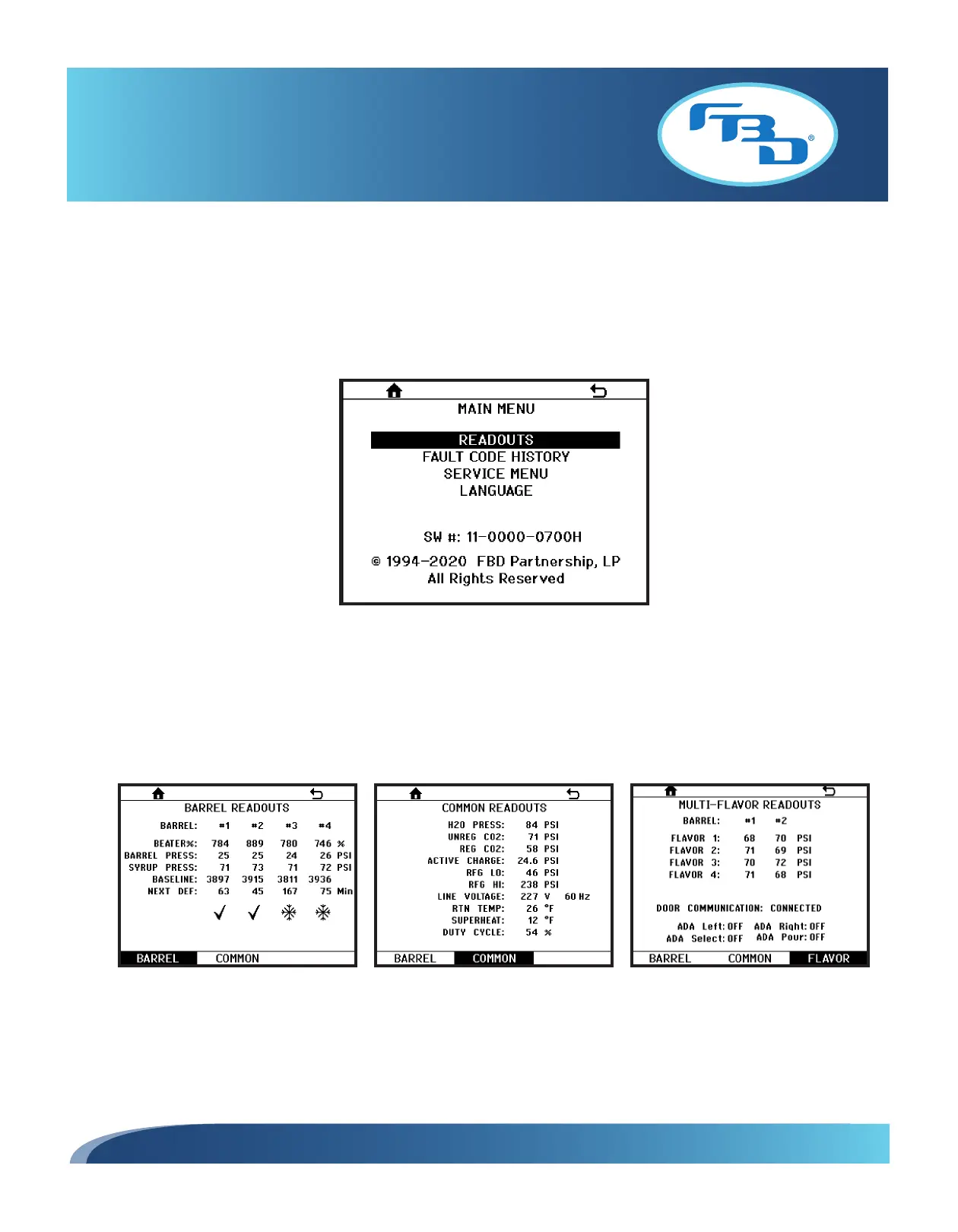 and 7.6). For multi-flavor dispensers, there will also be a third menu that shows the FLAVOR readouts (Figure 7.7).