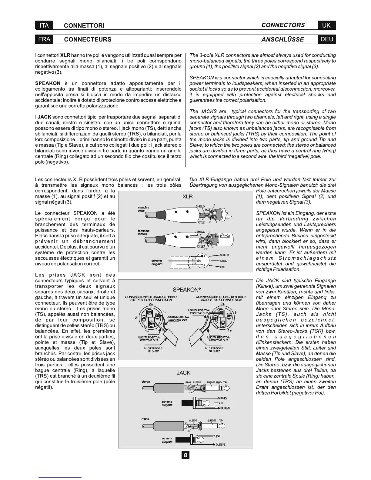 Fbt CLA 604A - Connectors; XLR Connector Details; SPEAKON Connector Details; JACK Connector Details