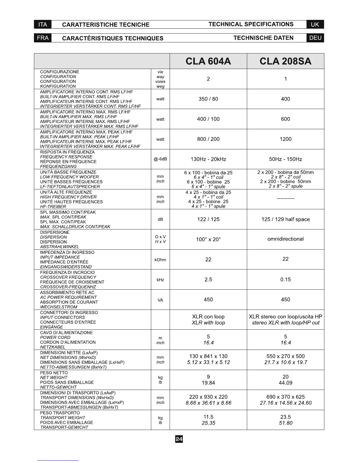 Fbt CLA 604A - Technical Specifications; CLA 604 A Technical Specifications; CLA 208 SA Technical Specifications