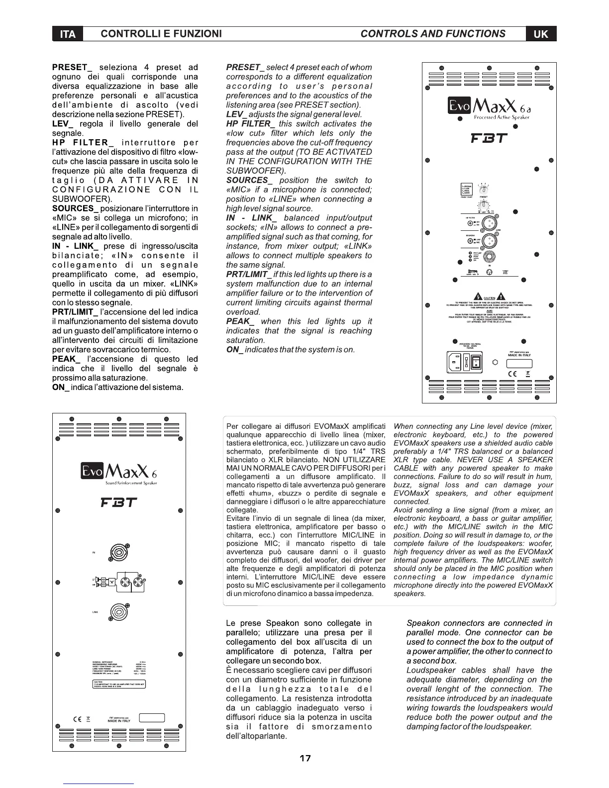 Fbt EVOMaxX 2A - EVOMaxX 6 Controls and Functions; Input, Signal, and Filter Controls; Indicators and Cabling Notes