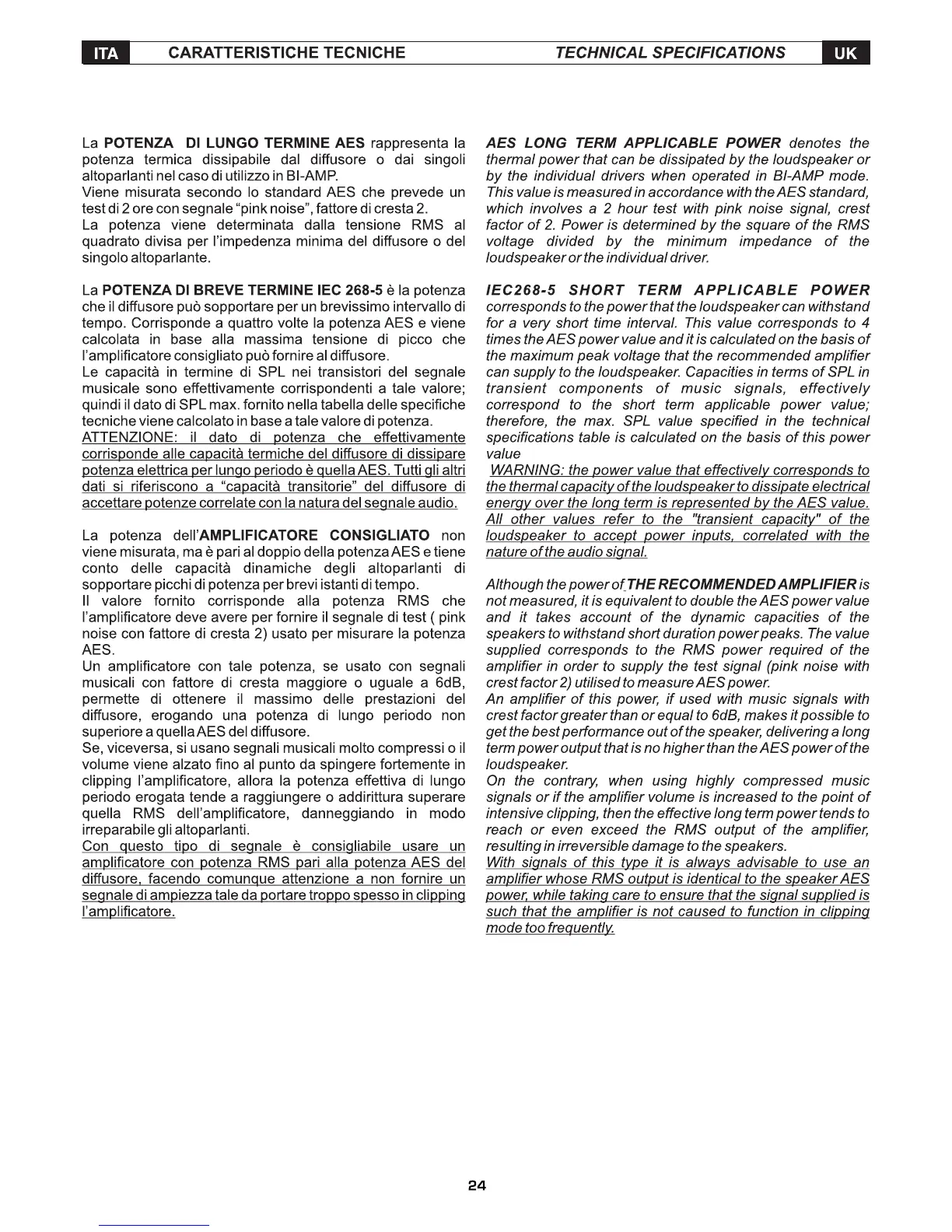 Fbt EVOMaxX 2A - Technical Specs: Power Ratings Explained; AES Long Term Power Explained; Short Term Power & Amplifier Matching