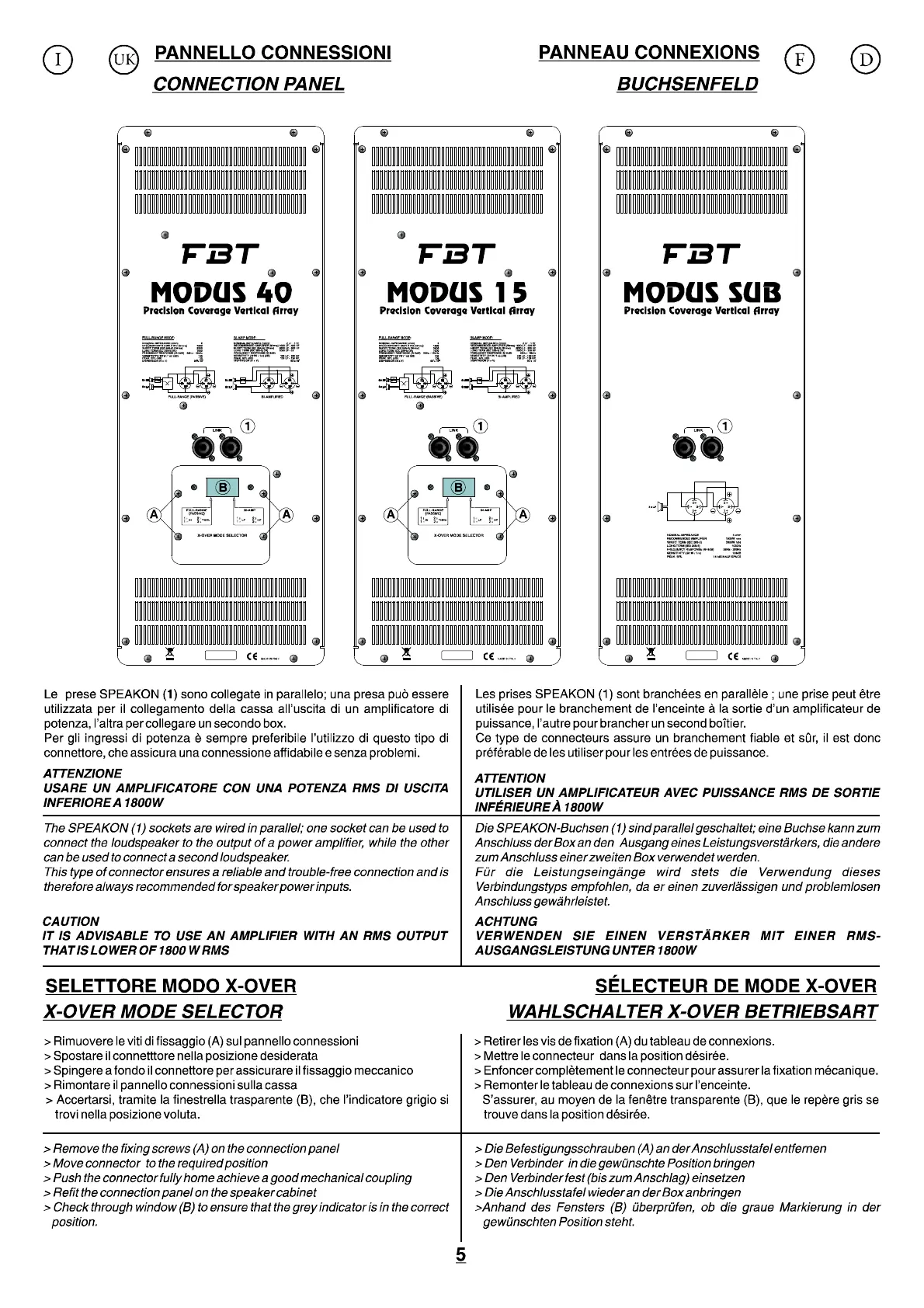 Fbt MODUS Series - Connection Panel Details; MODUS 40;15 Panel Details; MODUS SUB Panel Details; X-Over Mode Selector Operation