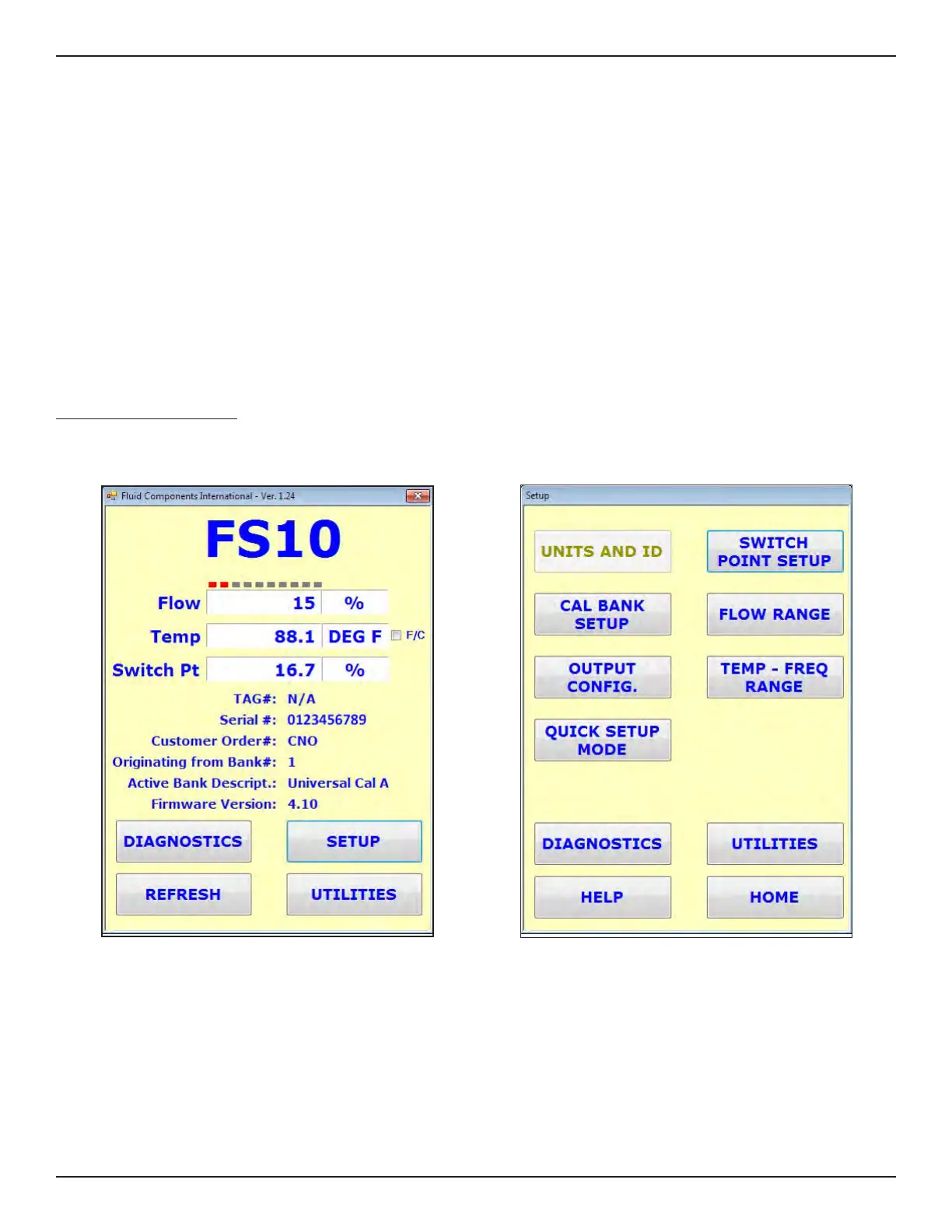 Below are typical screen shots of the FS10 Windows-based PC interface application. A brief description is given for each window (screen).