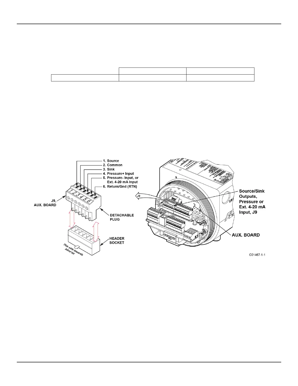 The 6-position terminal strip J9 on the auxiliary board provides connections for the source/sink outputs, pressure input, and the external 4-