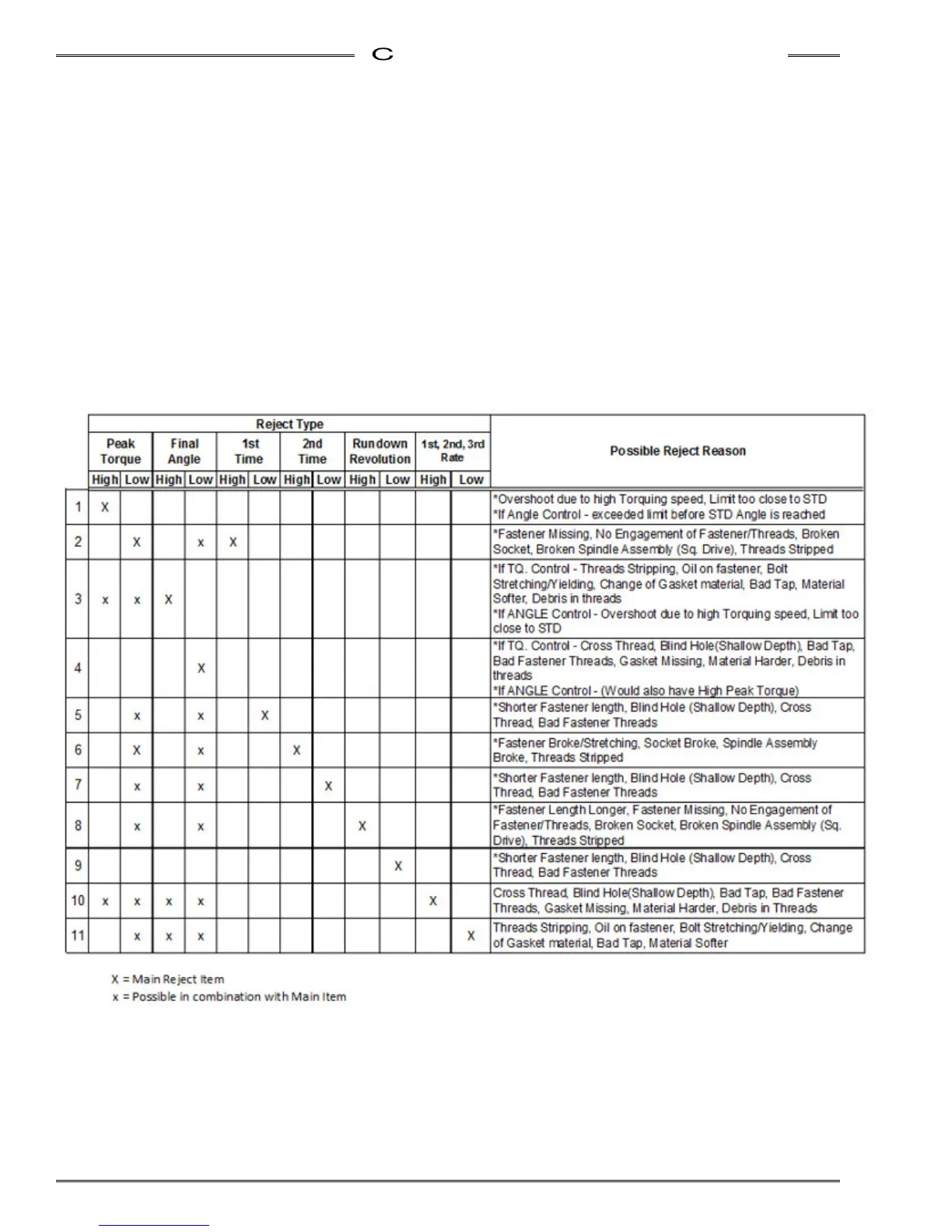 The chart below shows the type of Fastening Reject you may see with some common causes of the reject.
