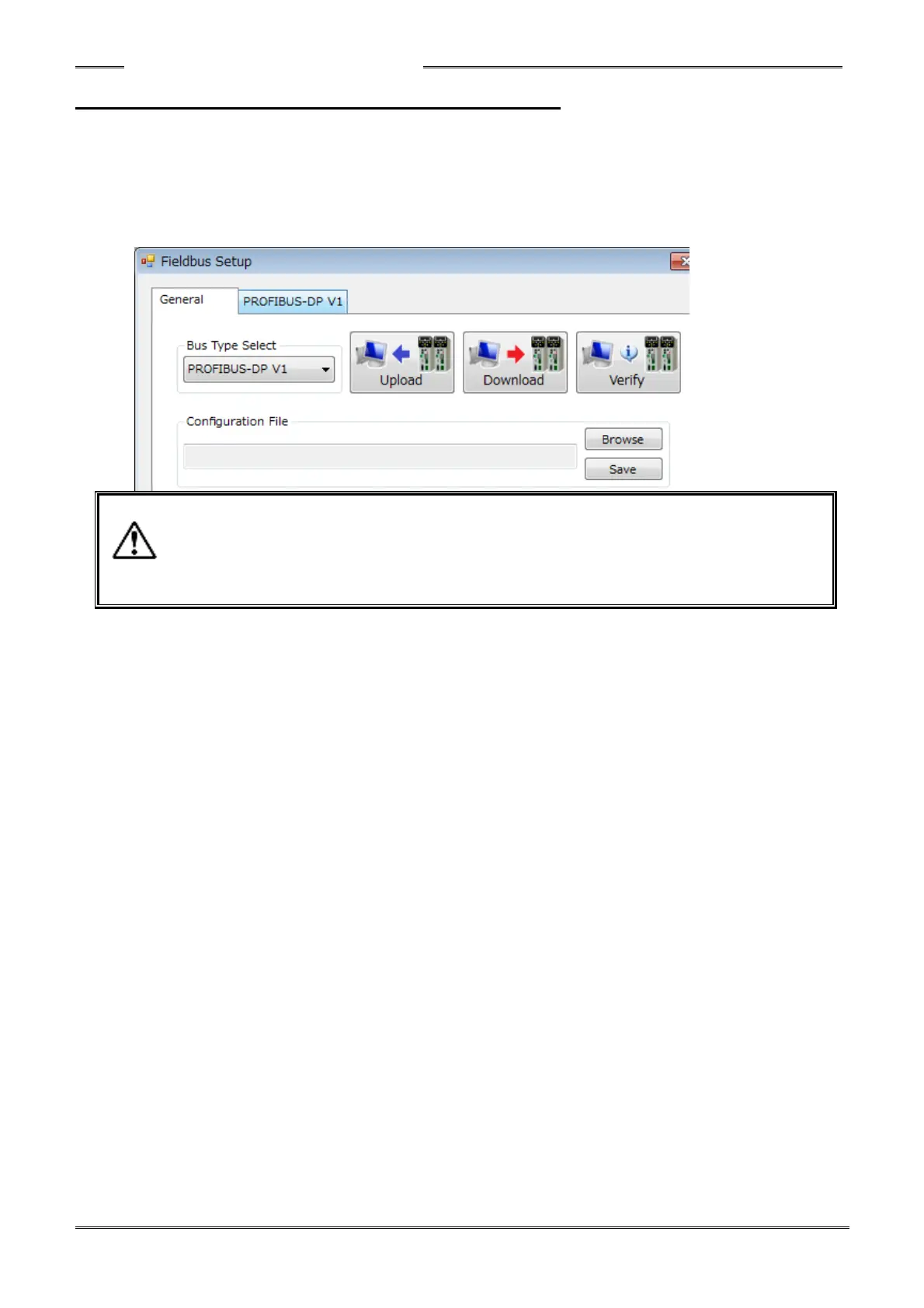 In the ‘Fieldbus Setup’ screen, selection of the fieldbus type, uploading, downloading, verification of