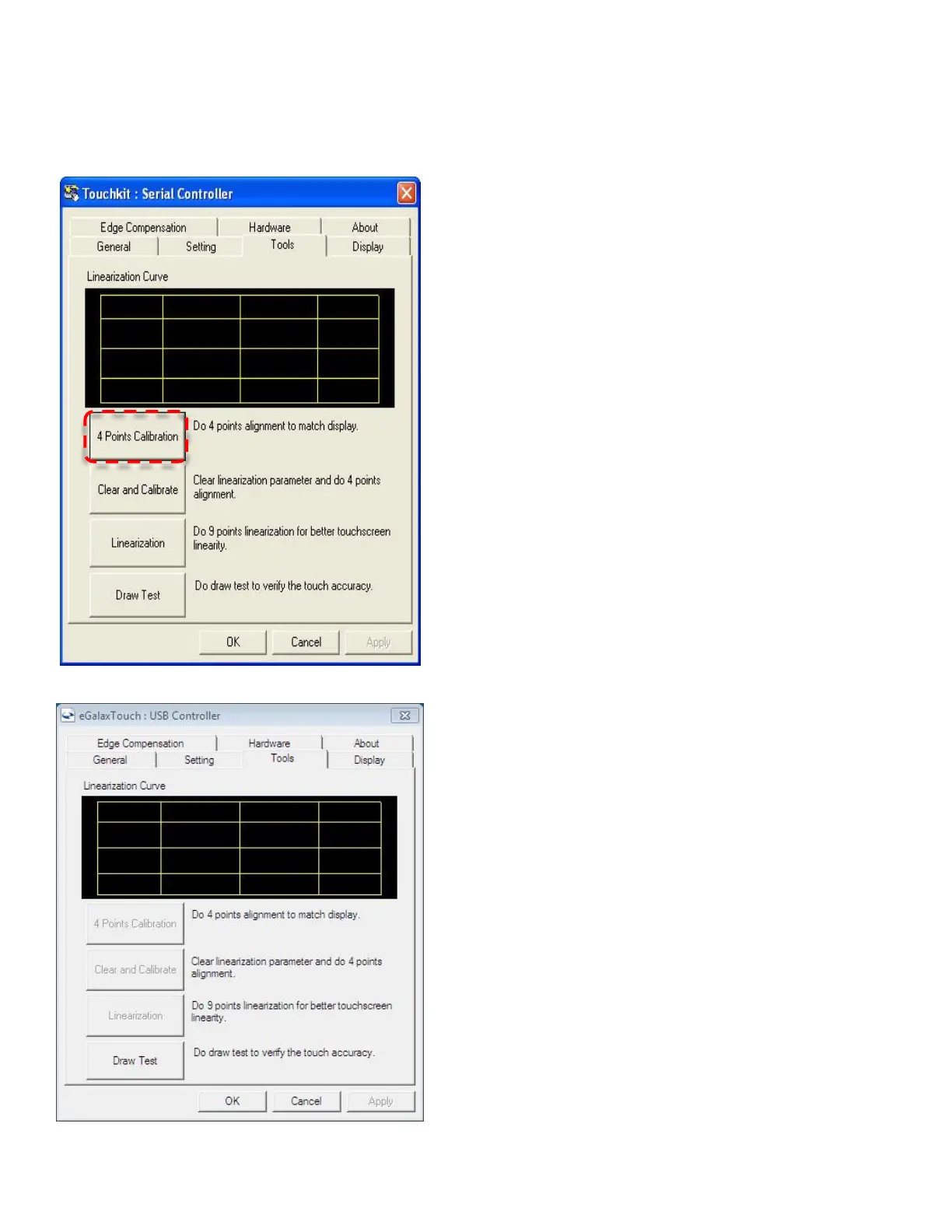 Tools allows the user to calibrate the touch panel via 4 Points Calibration