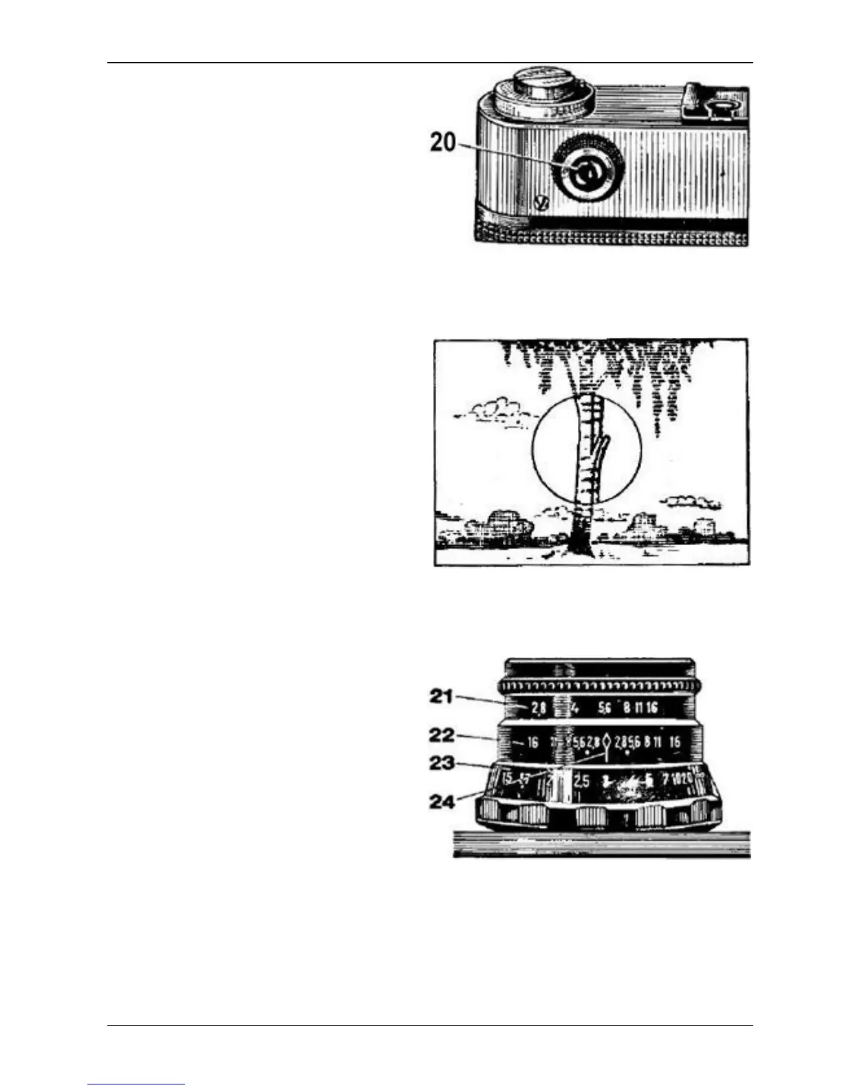 Depth-of-field scale 22 consists of two rows
