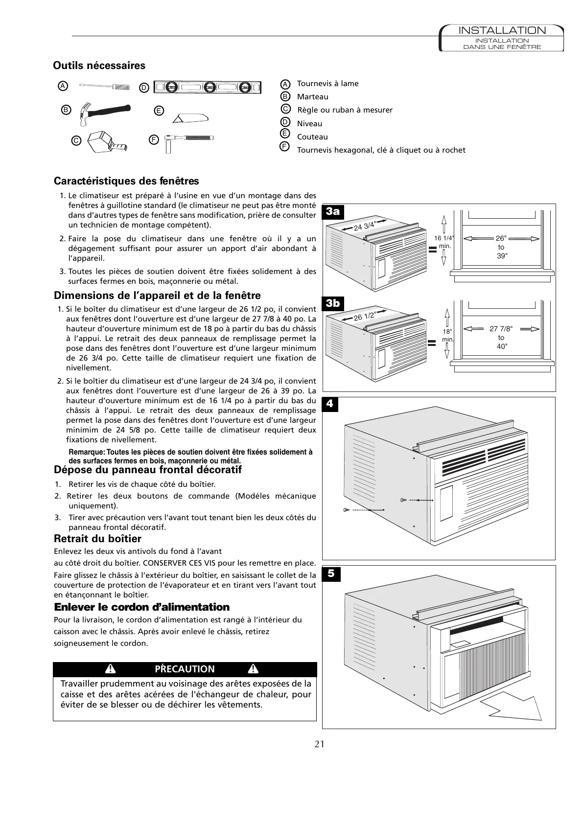 minímim de 24 5/8 po. Cette taille de climatiseur requiert deux