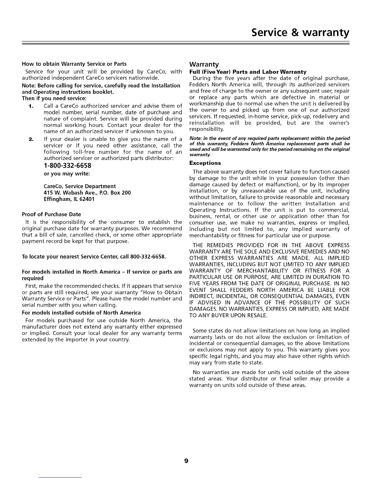 of this warranty. Fedders North America replacement parts shaft be