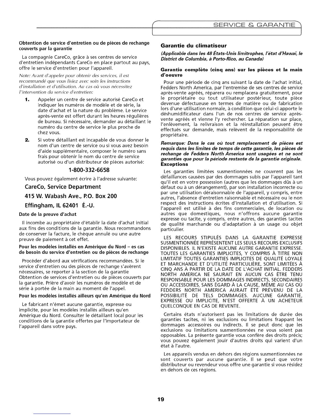 Fedders North America, par I'entremise de ses centres de service