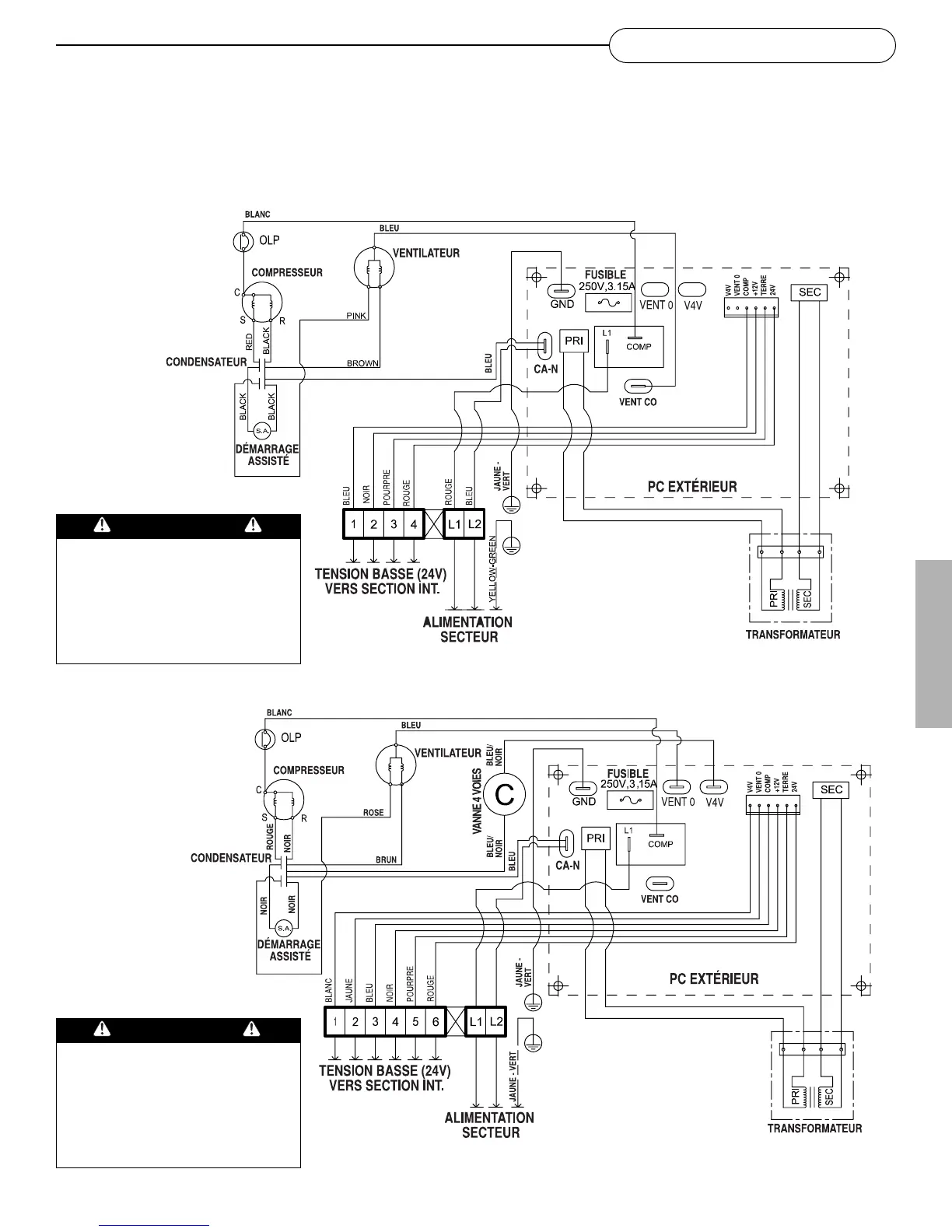 Voici les schémas de câblage des appareils avec refroidissement uniquement et avec pompe à chaleur.