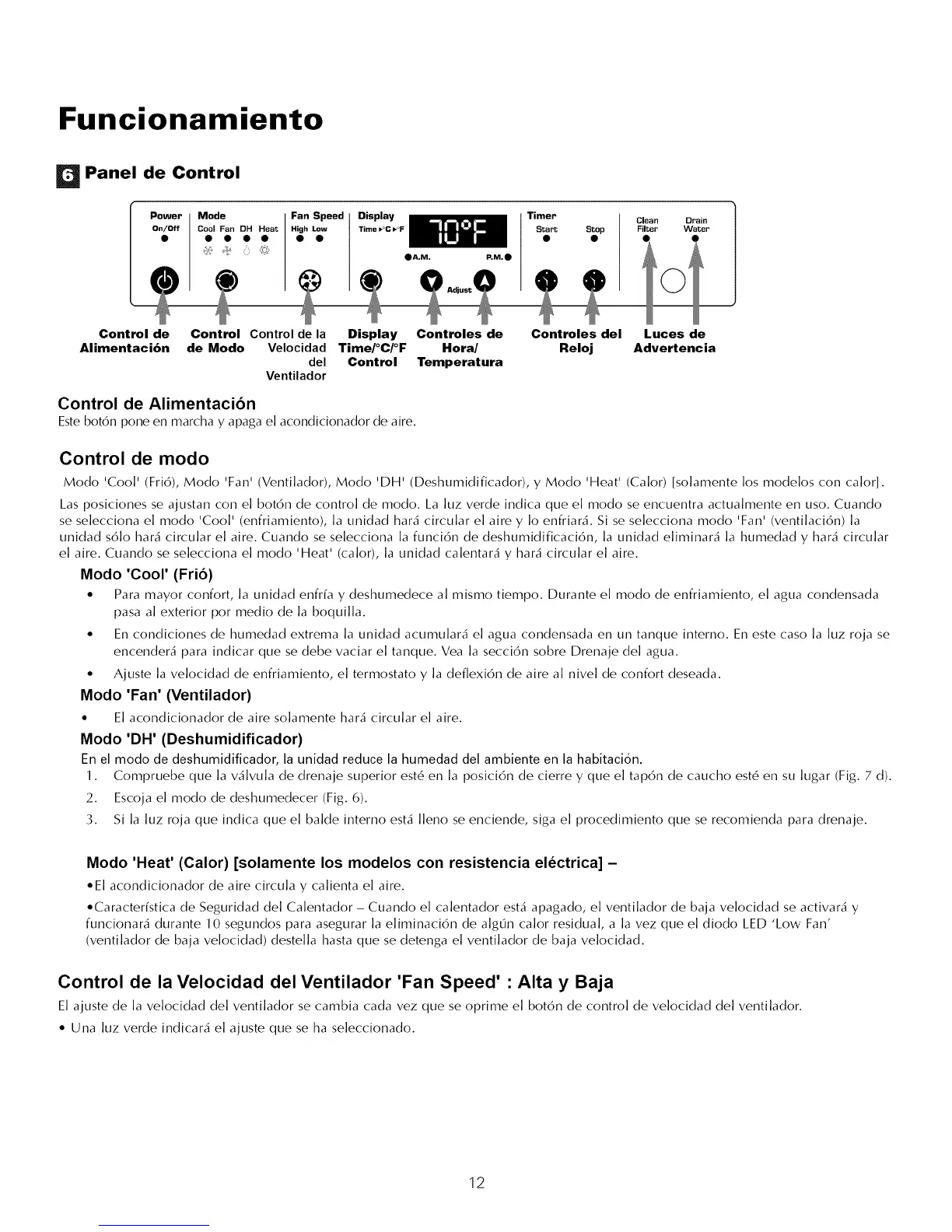 unidad s61o hara" circular el aire. Cuando se selecciona la funci6n de deshumidificaci6n, la unidad eliminara" la humedad y hara" circular