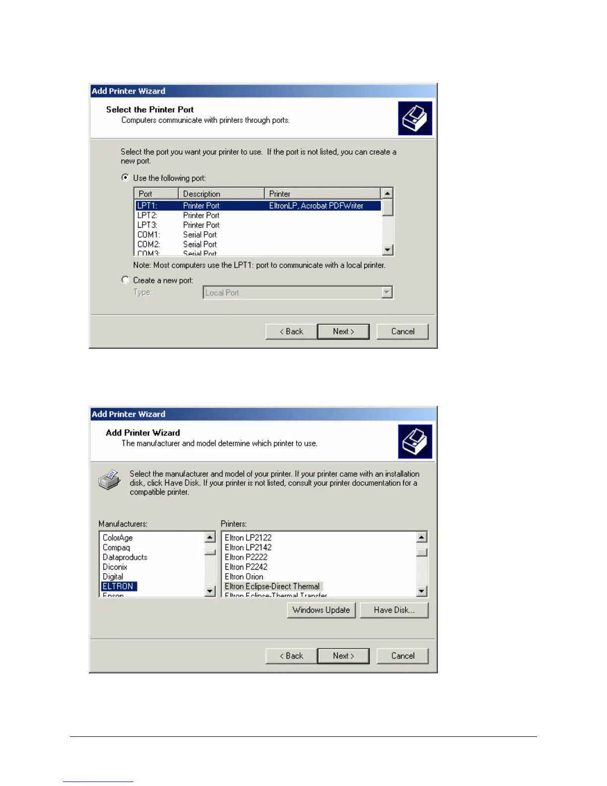 the sample Select the Printer Port window, LPT1 (parallel port) is selected. Click Next to continue.