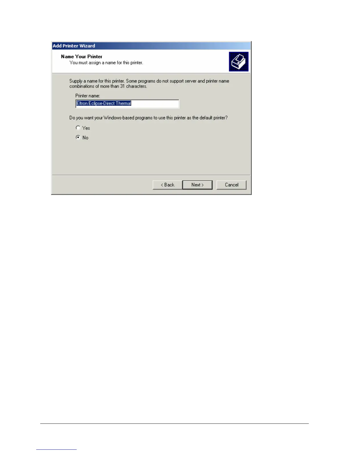 unavailable as the Windows default printer; otherwise, click Yes. Click Next to continue. The Printer