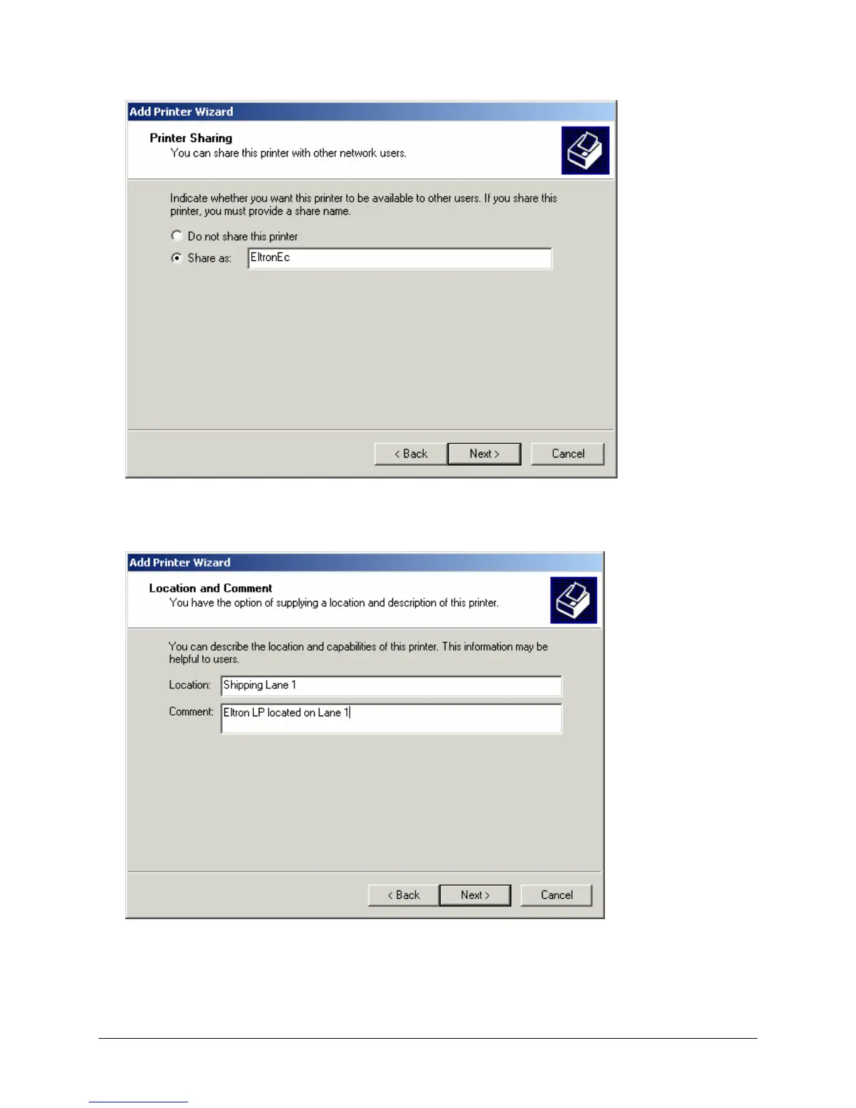 entered in the Name Your Printer window. Click Next to continue. The Location and Comment