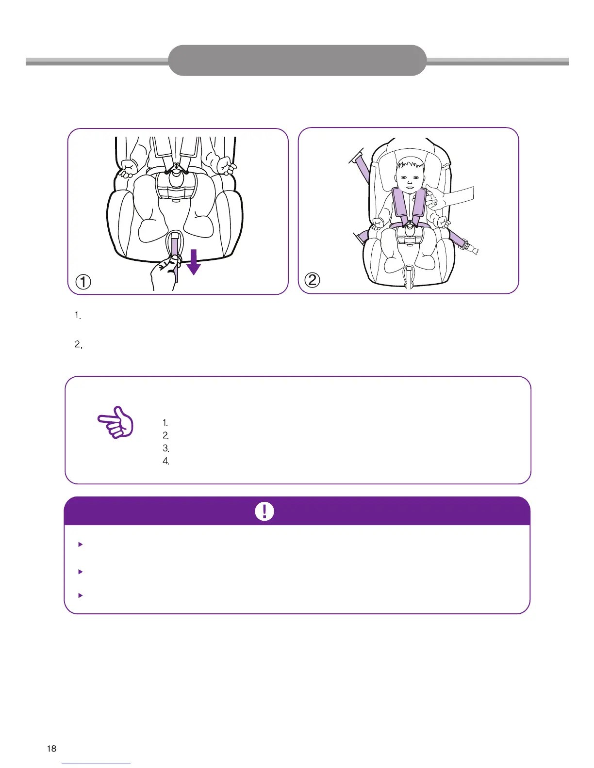 Pull the harness adjuster strap in the center slowly as in the picture ① for snug fitting so that the baby