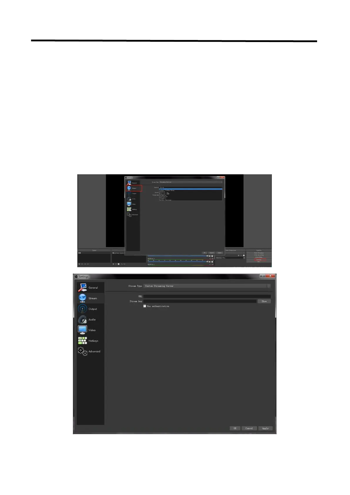 If choose Custom Service, just fill in URL and Stream Key.