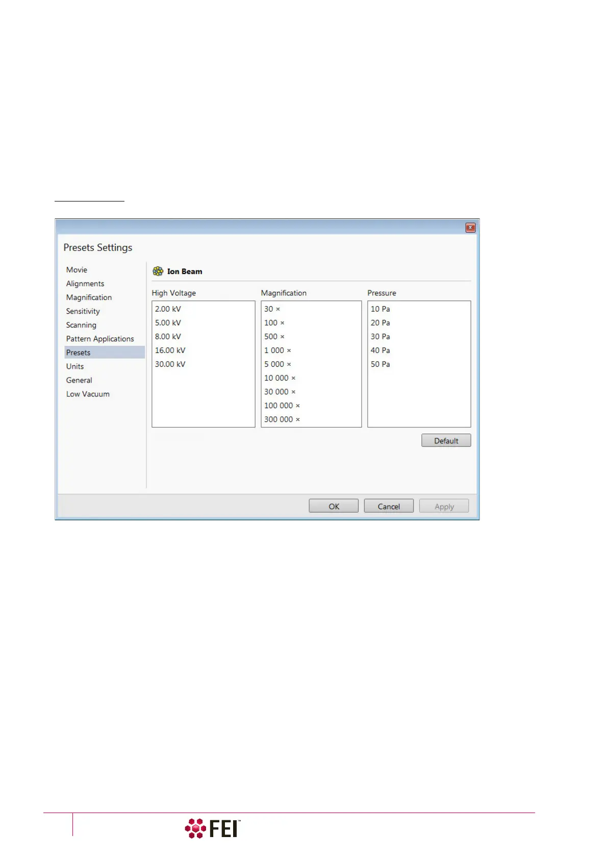 allows a user to change the pre-set values in the High Voltage and Magnification drop-down lists. The configuration