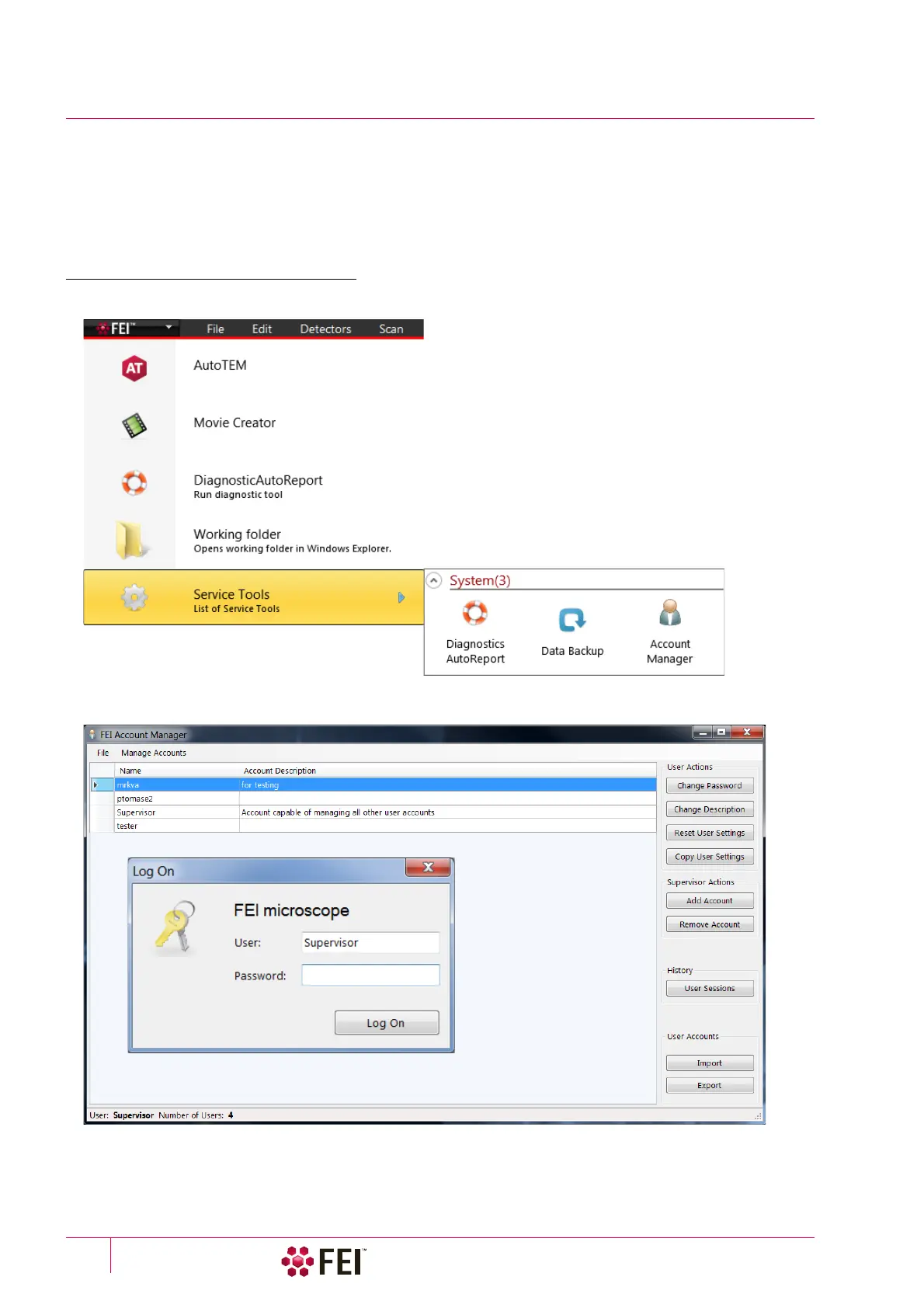 The FEI Account Manager application allows to a Supervisor (accounts manager) to organize user accounts. It