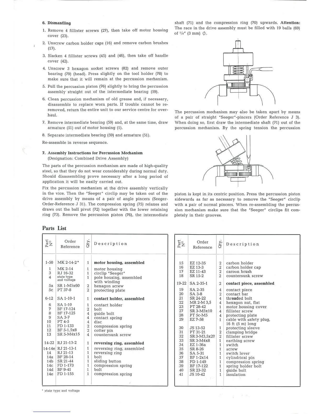 Fein ASb 53-2 - Dismantling and Assembly Procedures; 6. Dismantling Steps; 7. Assembly Instructions for Percussion Mechanism; Parts Lists and Diagrams