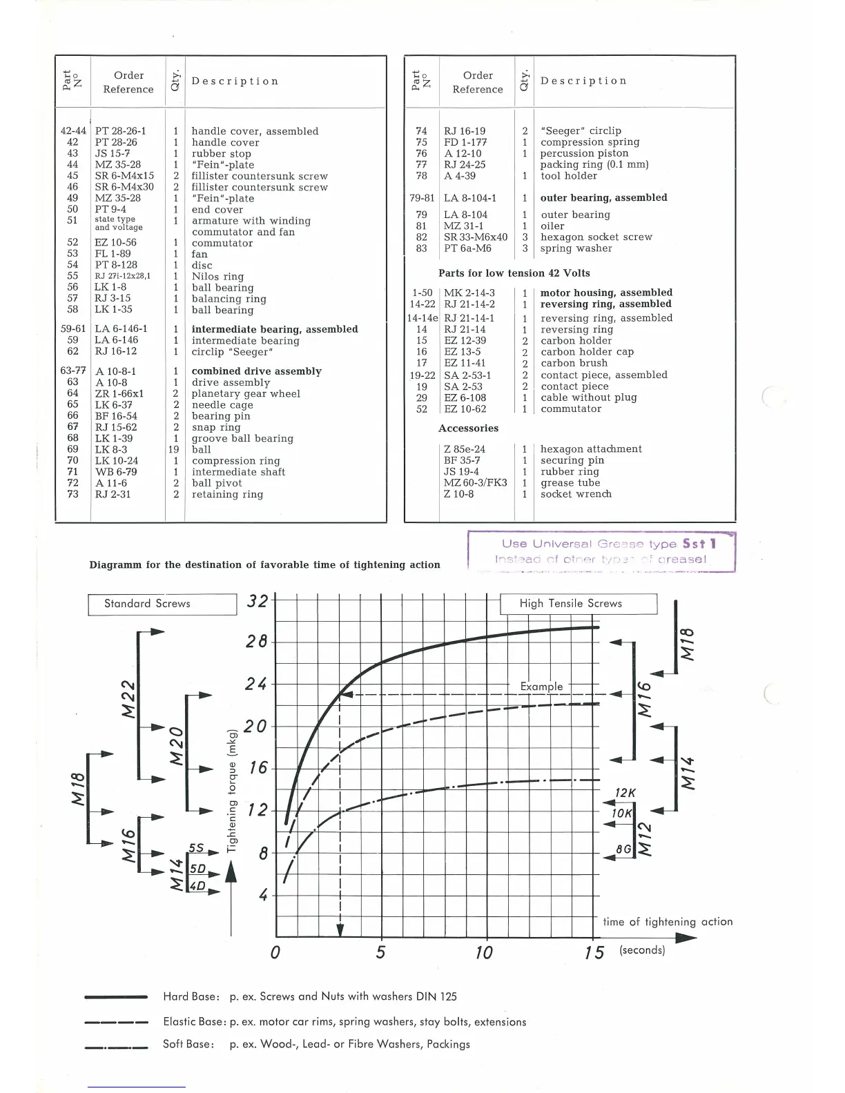 Fein ASb 53-2 - Parts List (Low Tension 42 Volts); Accessories List; Performance Diagram and Usage; Tightening Action Diagram