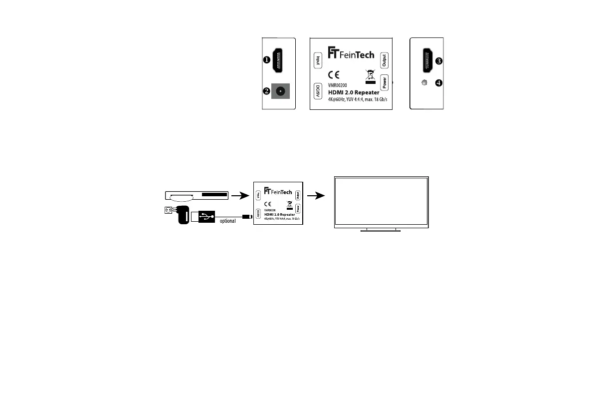 Die Stromversorgung erfolgt über das HDMI-Kabel durch die HDMI-Quelle. Die LED des Repeaters leuchtet, sobald ein Signal anliegt. Manche HDMI-Geräte können nicht genügend Strom lie-