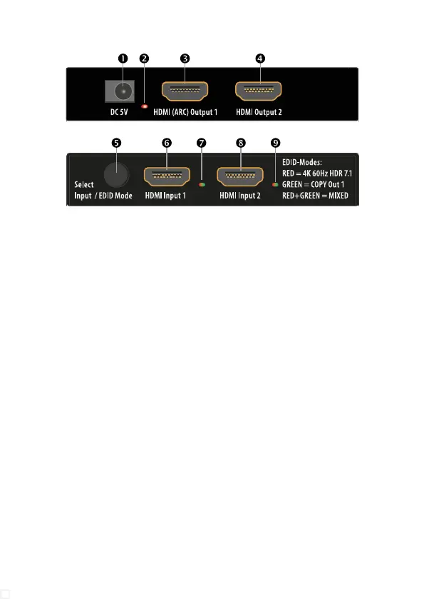 9. LED lights up when input 2 is active. green = EDID copy mode, red = EDID default mode, red