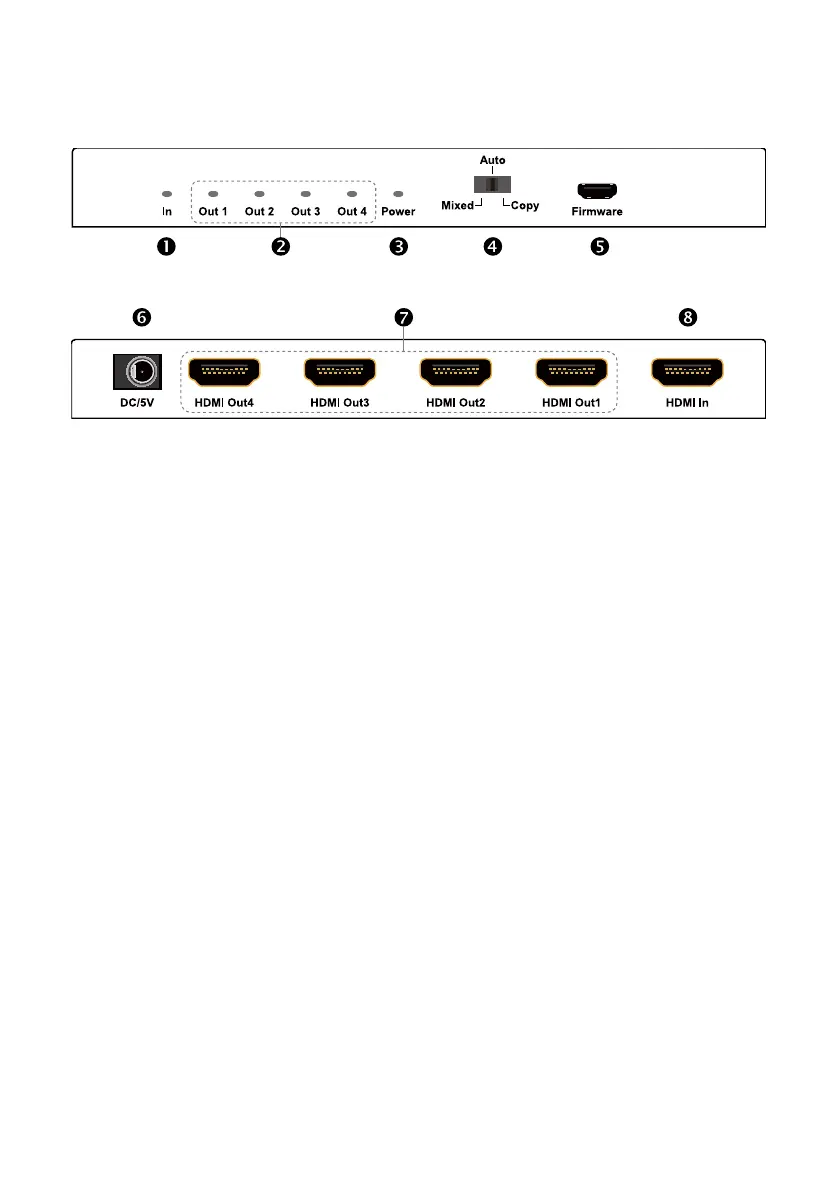HDMI Out 1–4: signal output for tv, monitor, video projector, or AVR (HDMI 4: priority in Copy EDID mode)