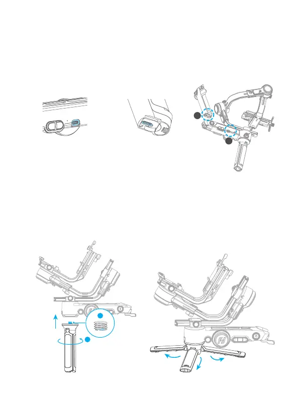 tripod ② to the bottom of the gimbal, then unfold the tripod and place the gimbal