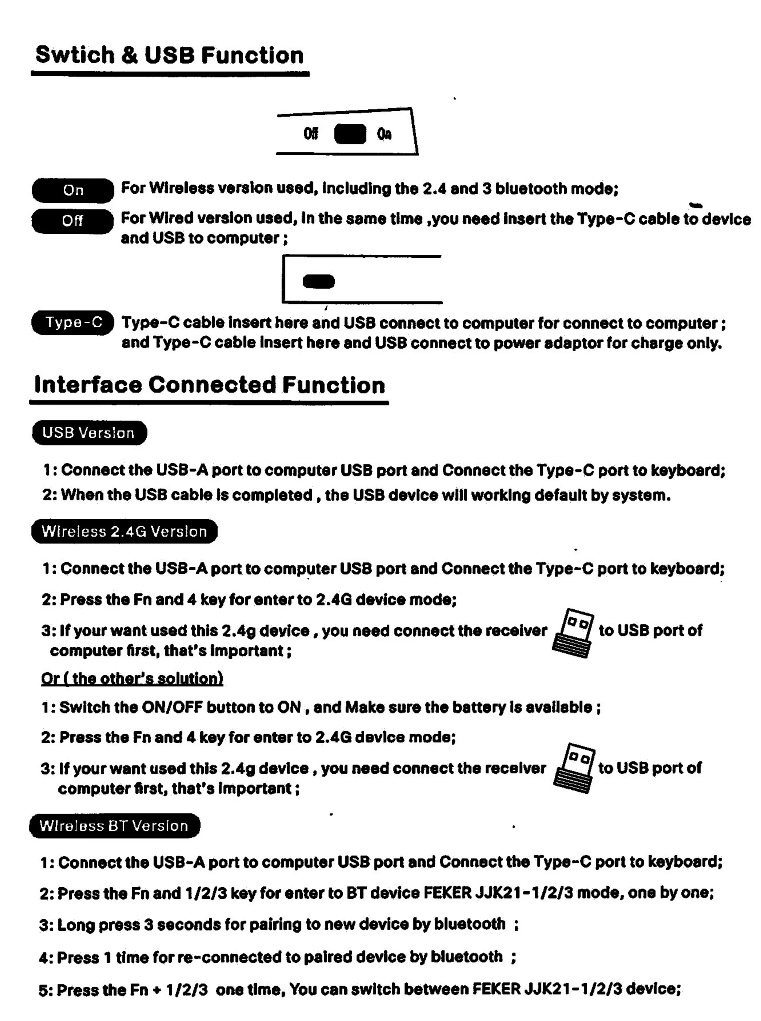 2: Press the Fn and 1/2/3 key for enter to BT device FEKERJJK21-112/3 mode, one by one;