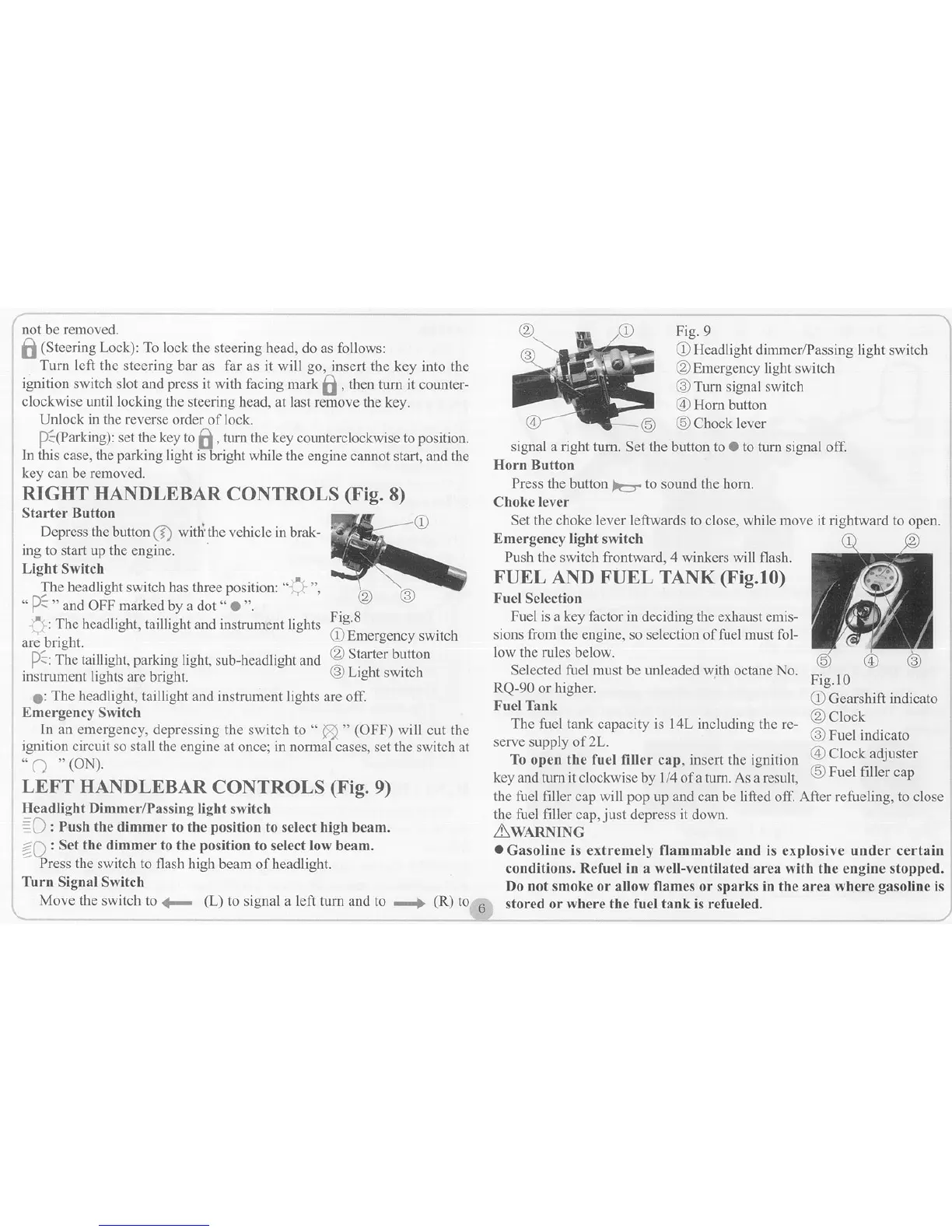 Fekon 150-14 - Right Handlebar Controls; Left Handlebar Controls; Fuel Selection; Fuel Tank