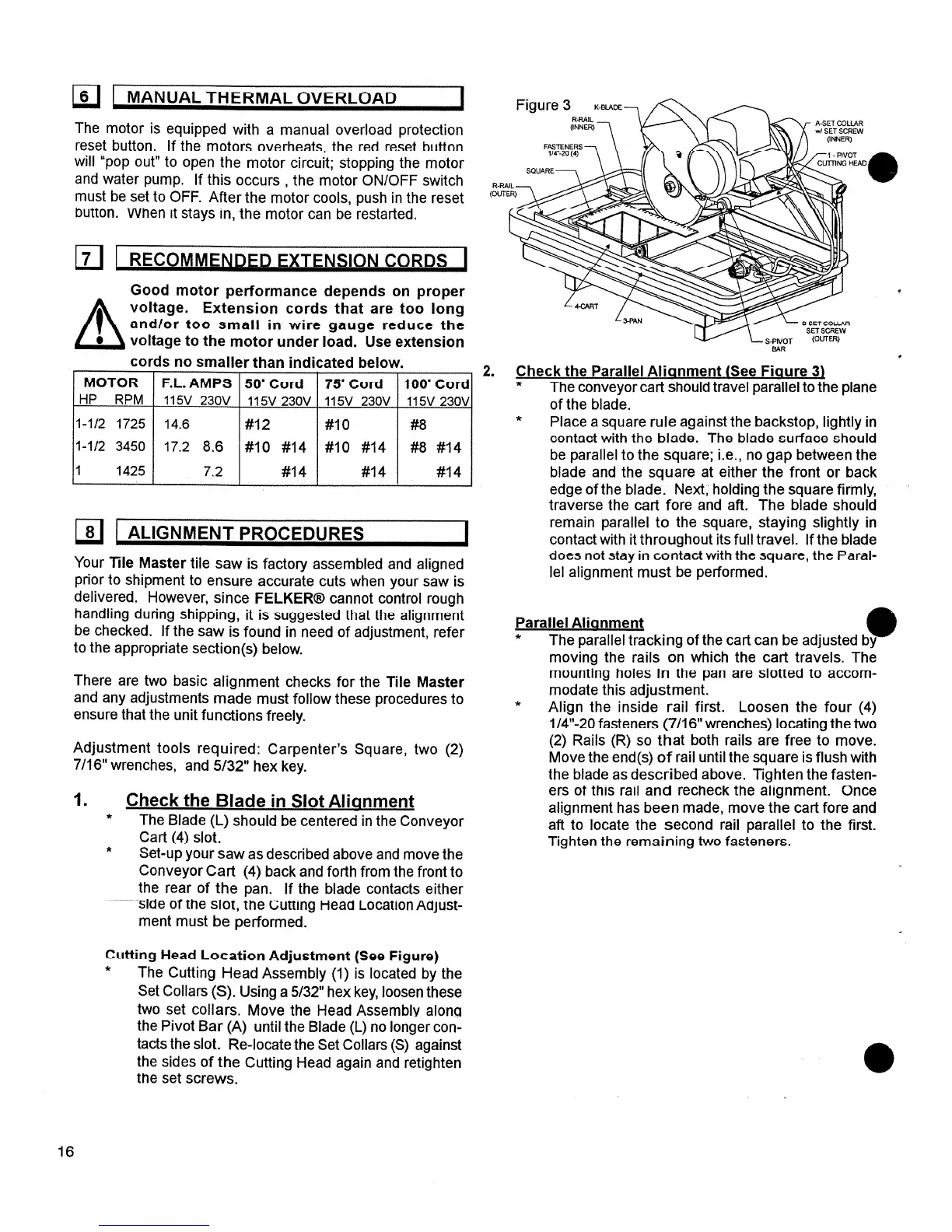 Felker TM-1HT - Maintenance and Alignment; Manual Thermal Overload Protection; Recommended Extension Cords; Alignment Procedures
