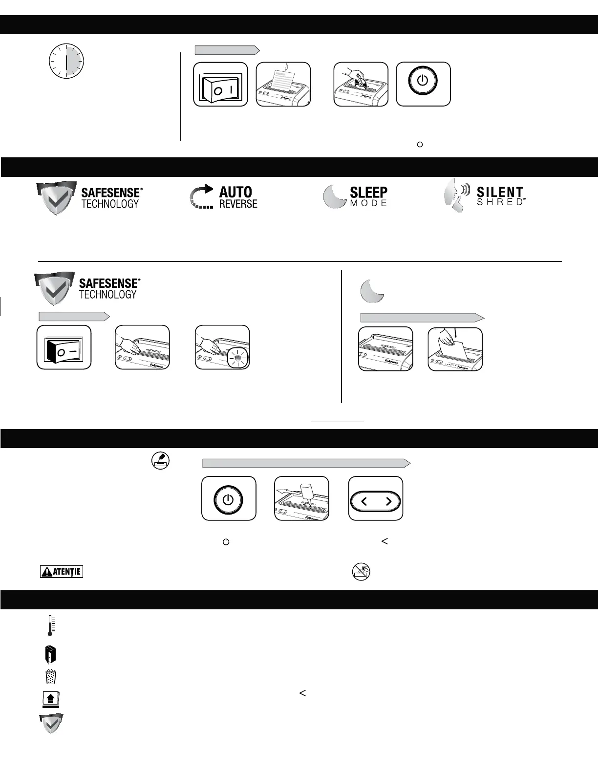 Coș plin: Când acest indicator este aprins, coșul de gunoi al aparatului este plin și trebuie golit. Folosiţi punga de gunoi Fellowes 36052.