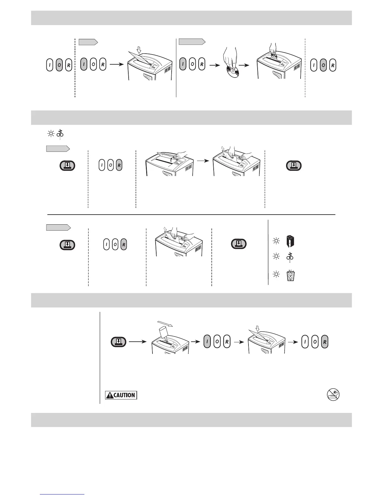 Paper jam: Set to Off (O) and empty bin. Replace bin, close door, and follow any or all of the below procedures.