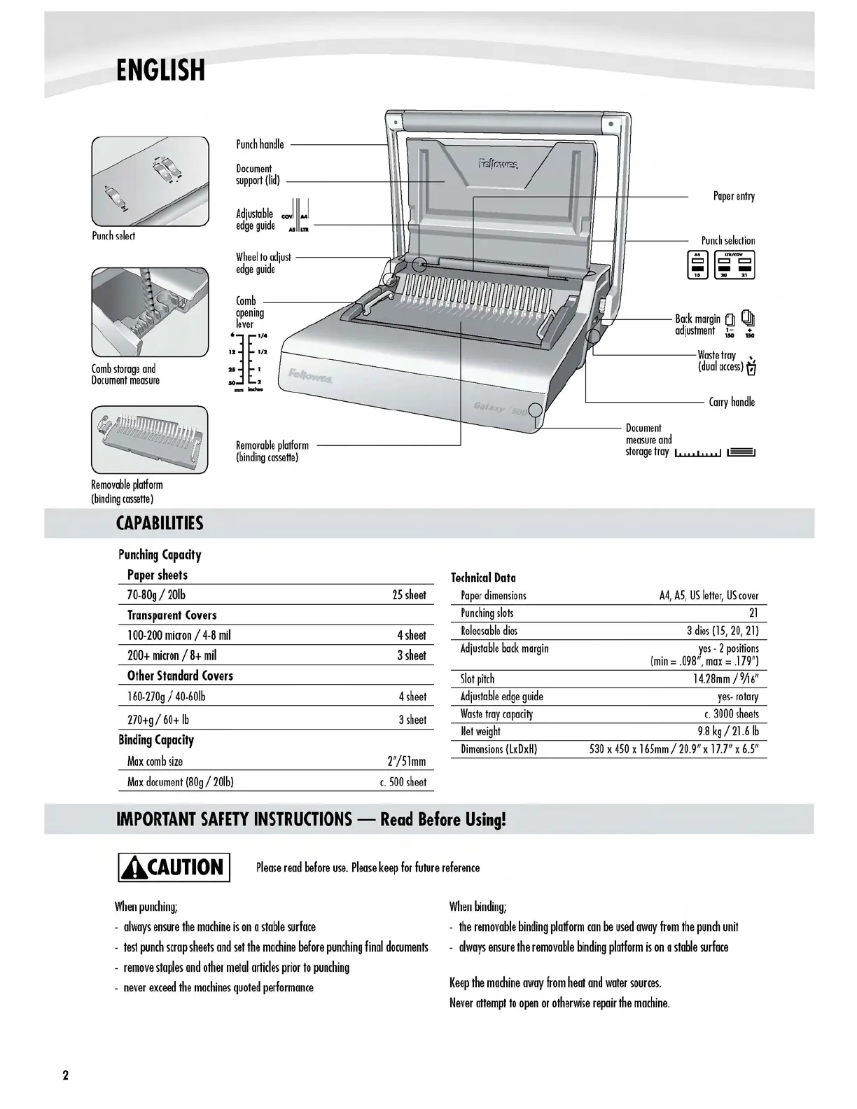 Fellowes Galaxy 500 - Capabilities; Punching Capacity; Technical Data; Important Safety Instructions