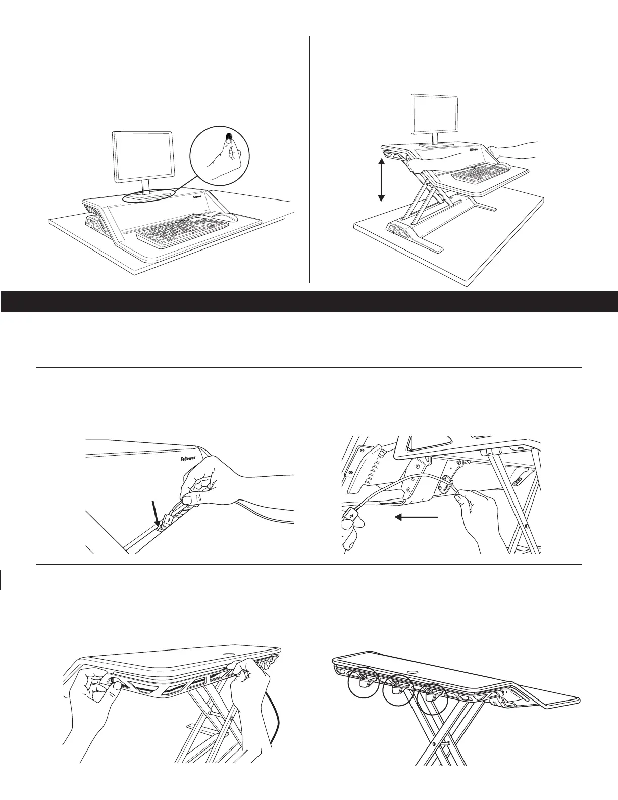 Ensure the workstation is at the highest position. Follow all cord routing instructions to ensure cables are not pinched by the support bars. Make sure