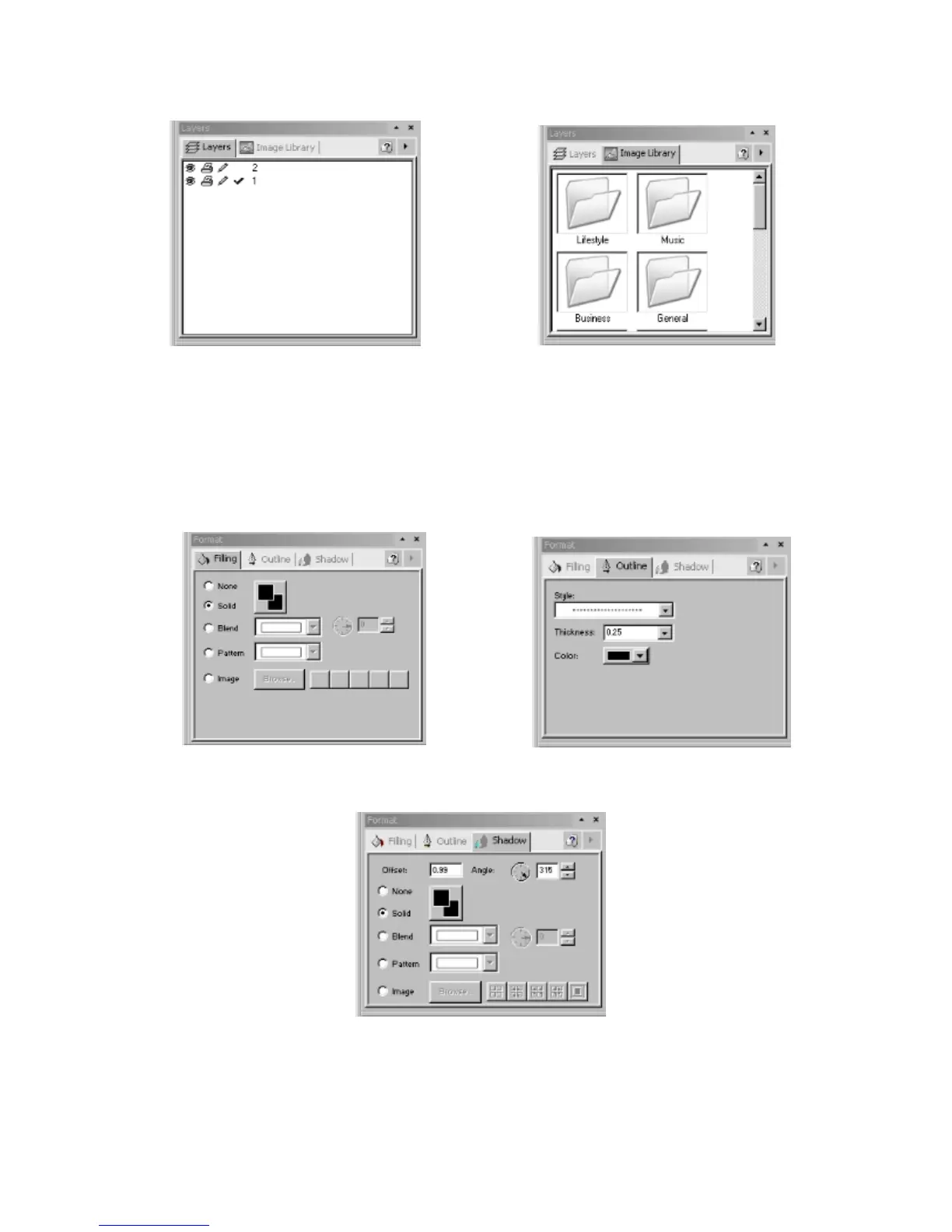filling, outline, shadow, foreground and background color. The palette dialog boxes are